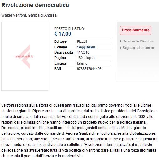 Siccome però non tutti sono giornalisti attenti come Cazzullo, e pertanto a qualcuno di voi la notizia potrebbe essere semplicemente sfuggita, la trovate qui (lancio) e qui (ritirata). Se invece volete provare ad acquistare ugualmente il libro on line, giusto per vedere l’effetto che fa, il sito della Feltrinelli sembra non essersi ancora accorto di niente:
