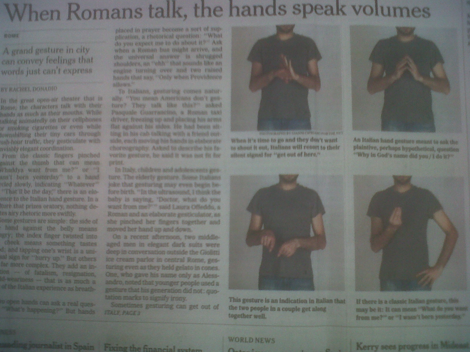 Buona parte della prima pagina dell’Herald Tribune di oggi è dedicata alla notizia che i romani, quando parlano, gesticolano. Mi sarebbe piaciuto assistere alla riunione di redazione, soprattutto nel momento in cui qualcuno – il caporedattore, il caposervizio, lo stesso autore dello scoop? – deve avere detto: “Serve un modello per le foto dei gesti. E mi raccomando le didascalie”.