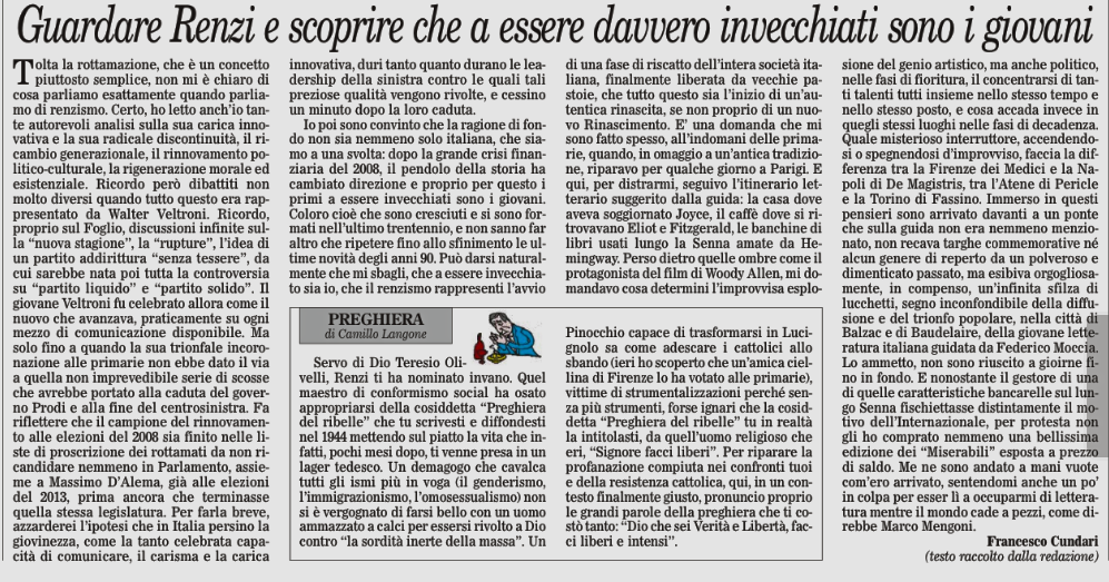 Può darsi che da tutto questo gran parlare di rinnovamento venga anche, davvero, qualcosa di nuovo. Personalmente, non sono così affezionato né al governo Letta né all’attuale proliferazione di contratti precari. Ma è tutto da dimostrare che le alternative siano effettivamente preferibili, o anche solo più nuove (qui, in proposito, la mia opinione consegnata a caldo al Foglio, nel divertente dibattito organizzato dal giornale su renzismo e giovanilismo all’indomani delle primarie).